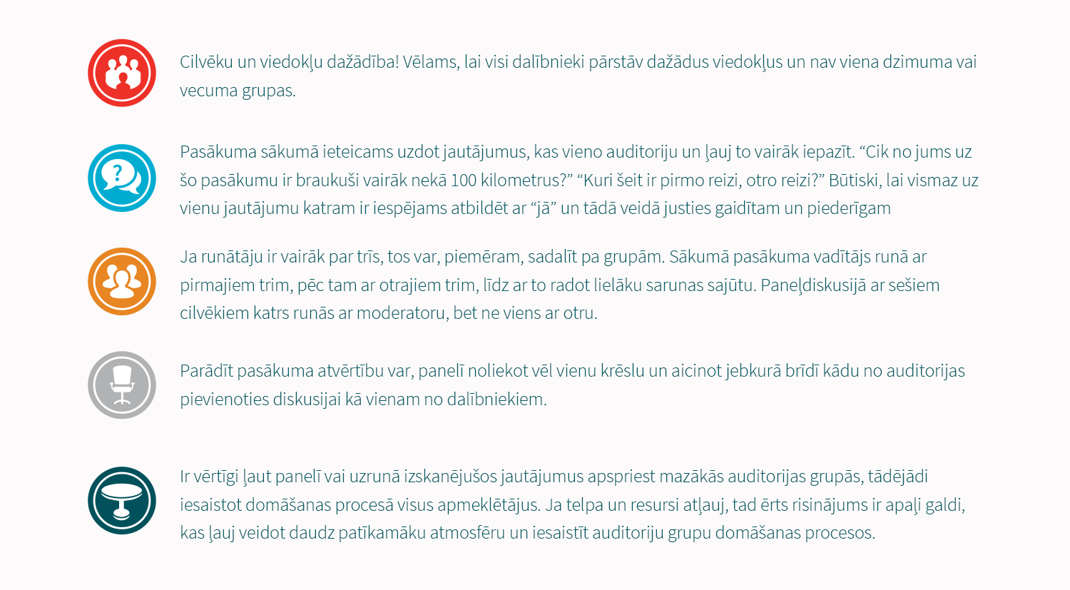 Sarunu festivālā LAMPA bieži izmantots formāts. Lūk, daži ieteikumi, kas diskusiju padarīs produktīvāku un iesaistošāku: