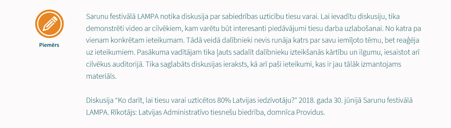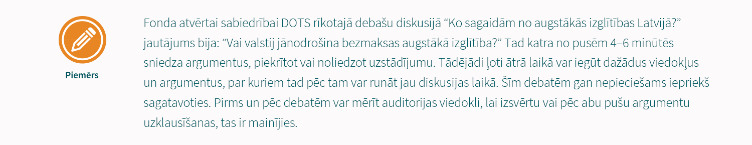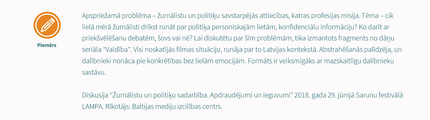 Piemērs formātam, kas vērsts uz publikas ieguvumu. Klātienes diskusija tiek papildināta ar iepriekš sagatavotu materiālu – video, kur izteikti viedokļi par diskusijā apspriežamajiem jautājumiem.