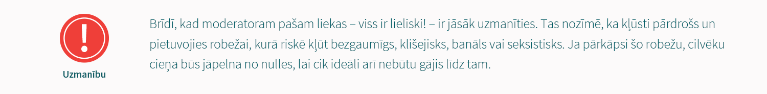 Moderatoram ir tiesības uzdot “stulbo jautājumu”. Puse zāles atviegloti uzelpos, jo nebūtu uzdrošinājušies to uzdot paši. Tas pats attiecas uz diskusijā bieži pieminētiem terminiem – ir tikai normāli, ja moderators pārjautā, ko tie īsti nozīmē.
