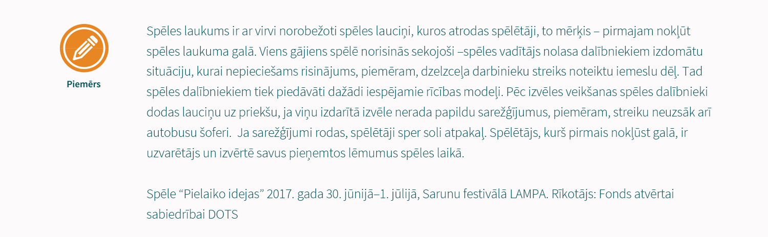 Pasākums norisinās spēles veidā. Spēlei ir vadītājs un noteikumi, ar kuriem sākumā tiek iepazīstināti spēles dalībnieki.