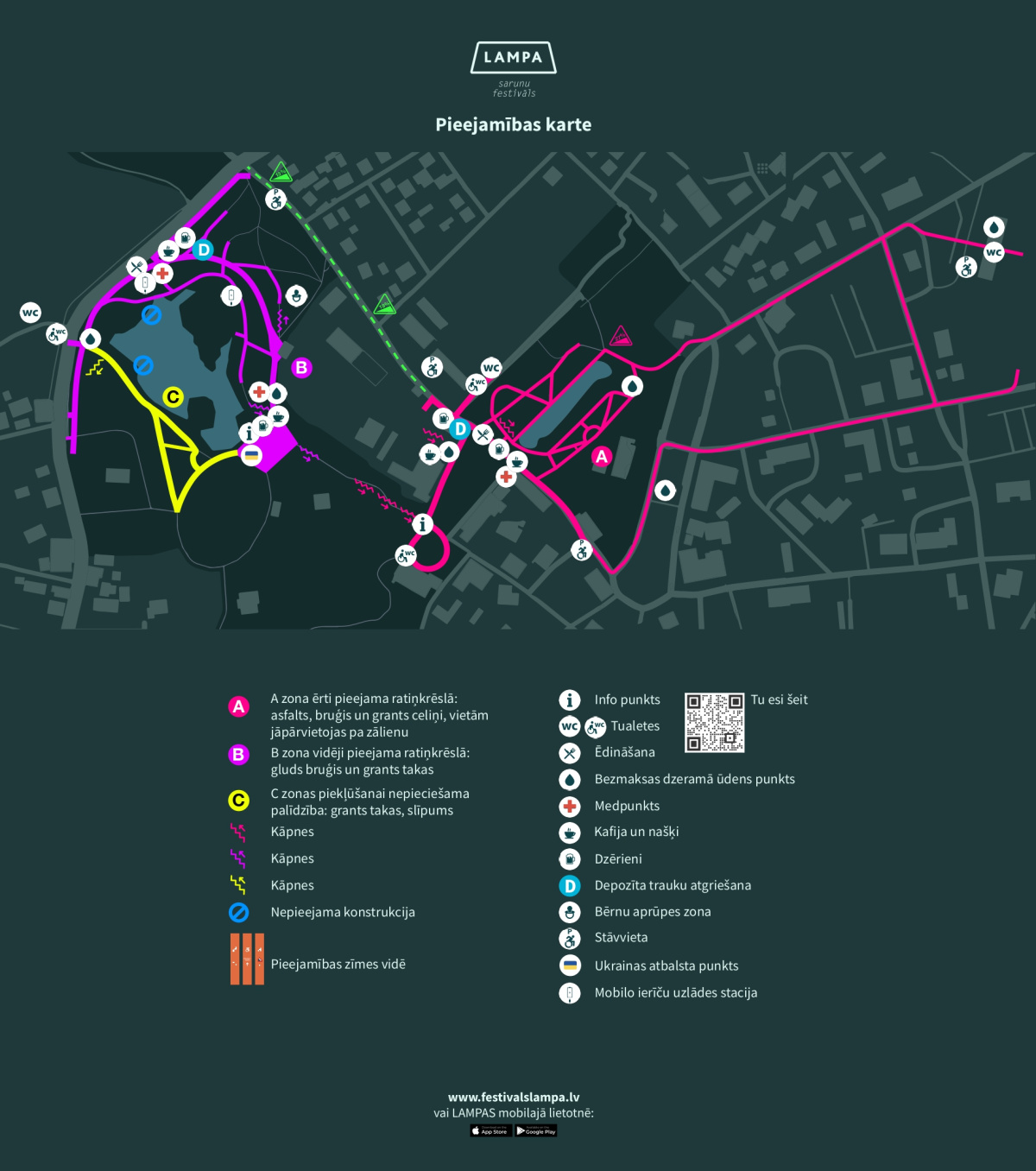 Šajā sadaļā atradīsiet informāciju par piekļūstamību festivāla teritorijā, tostarp festivāla piekļustamības karti, kas palīdzēs sagatavoties festivāla apmeklējumam.