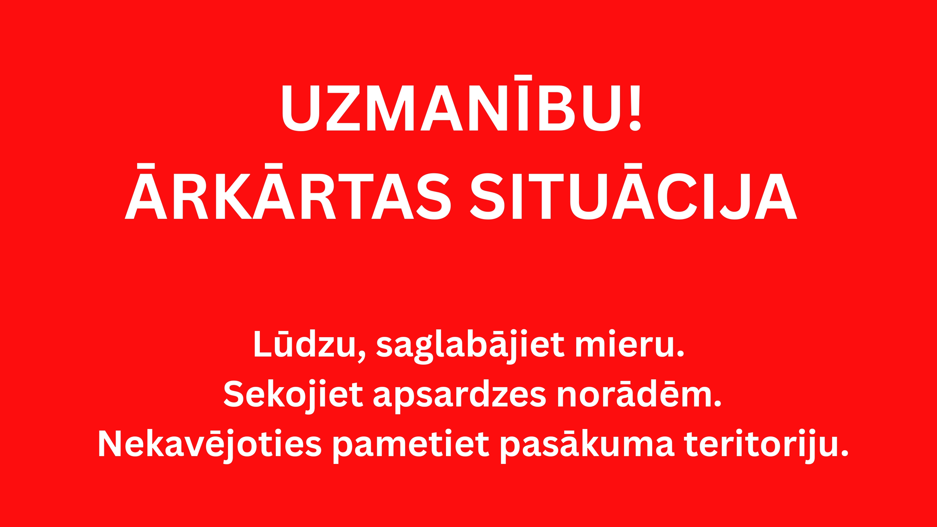 Ja festivāla norises laikā tiks izziņots drošības paziņojums, tas tiks parādīts uz skatuvju ekrāniem. Ja redzat šādu attēlu, lūdzu, ievērojiet darbinieku norādījumus un dodieties uz tuvāko izeju.