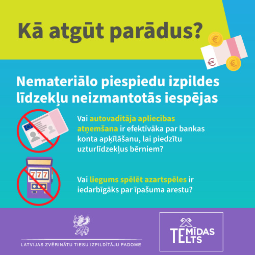 Lai nodrošinātu tiesu un citu institūciju nolēmumu izpildi, šobrīd normatīvais regulējums paredz septiņus materiāla rakstura piespiedu izpildes līdzekļus veidus. Taču apķīlāts konts vai īpašumu arests ne vienmēr dod efektīvāko rezultātu. Autovadītāja apliecības anulēšana, liegums spēlēt azartspēles, ierakstīšana parādnieku sarakstā un citi nemateriālie piespiedu izpildes līdzekļi var būt noderīgāka “zaļā gaisma” ceļā uz ātru un efektīvu nolēmumu izpildi un personu paradumu maiņu.